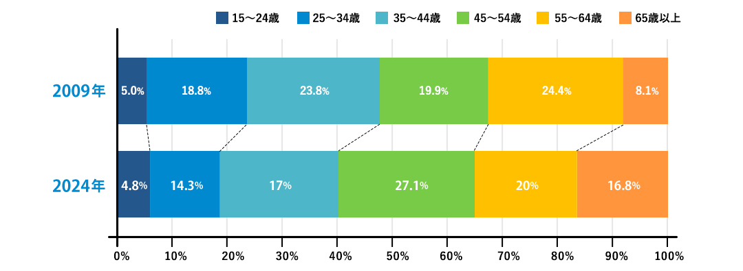 建設業就業者は、55歳以上が約37%、34歳以下が約19%と、高齢化が進行して次世代への技術承継が大きな課題となっています。